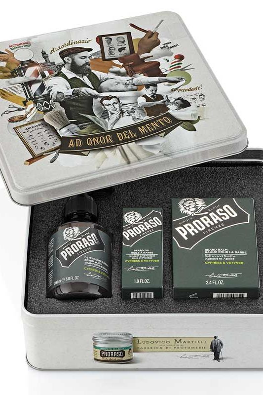 Whether a new beard, short beard, or long, thick beard, Proraso’s Single Blade Collection Beard Care Tin contains everything a gentleman needs to care for any and every stage of beard growth. Set includes Beard Wash, a gentle, yet effective, cleanser for both beard and skin; Beard Balm, to soften hair and ease itch and irritation associated with new growth; and Beard Oil, to nourish, smooth and protect the beard while softening and adding sheen.