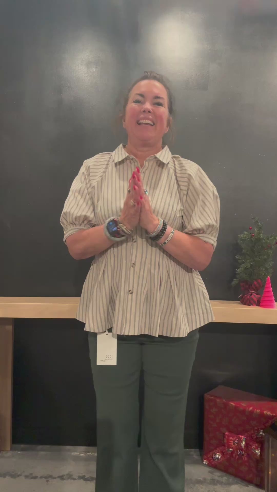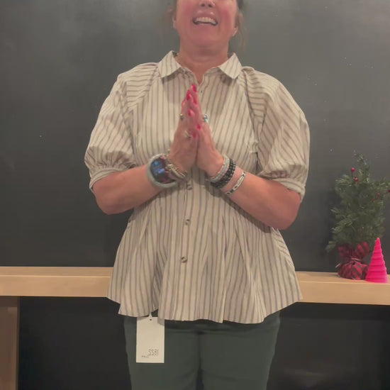 Add a flirty twist to your everyday look with this short-sleeve collared shirt. Featuring playful stripes and a cinched waist, it flatters your silhouette while keeping things effortlessly cute. The button-down front makes it easy to style for work or weekend fun.