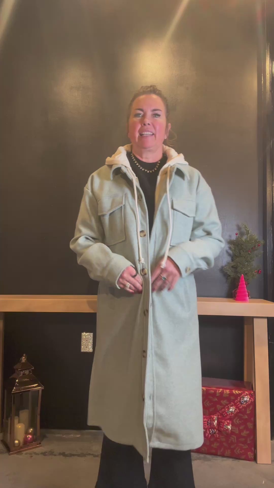 Stay cozy and stylish with the Twofer Hoodie Jacket in Seafoam. This playful piece zips up and buttons down for versatile wear, featuring an attached hoodie layer for extra warmth. Knee-length design adds flair and comfort, while bust and side pockets keep your essentials close with a fun twist. Perfect for layering on any adventure!