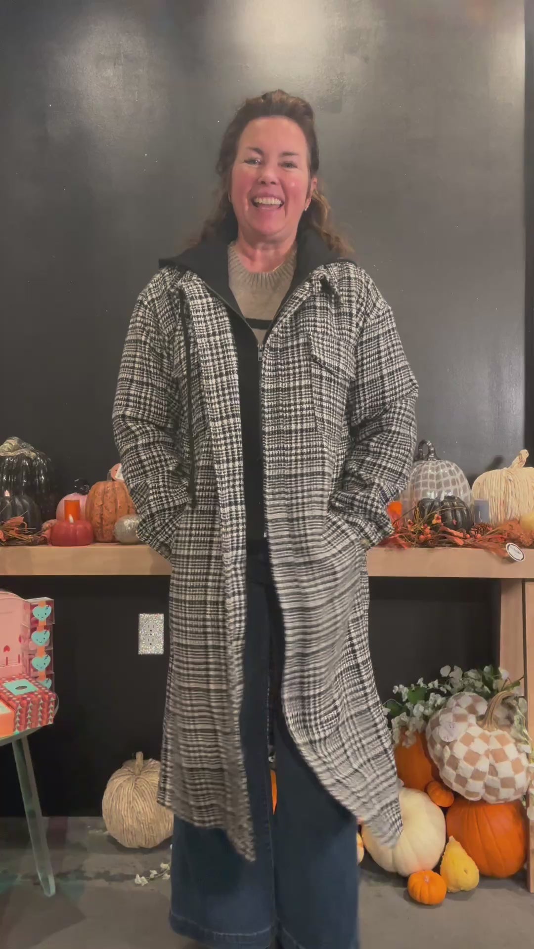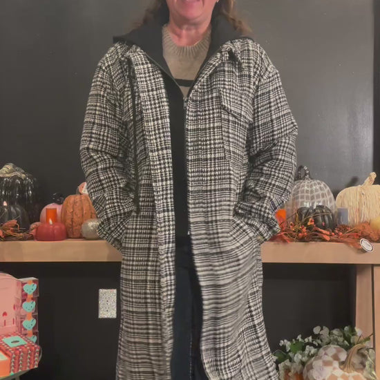 Stay cozy and stylish with the Twofer Hoodie Jacket in Black. This playful piece zips up and buttons down for versatile wear, featuring an attached hoodie layer for extra warmth. Knee-length design adds flair and comfort, while bust and side pockets keep your essentials close with a fun twist. Perfect for layering on any adventure!